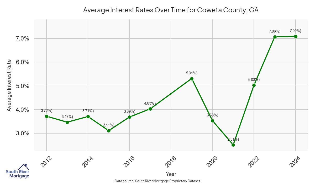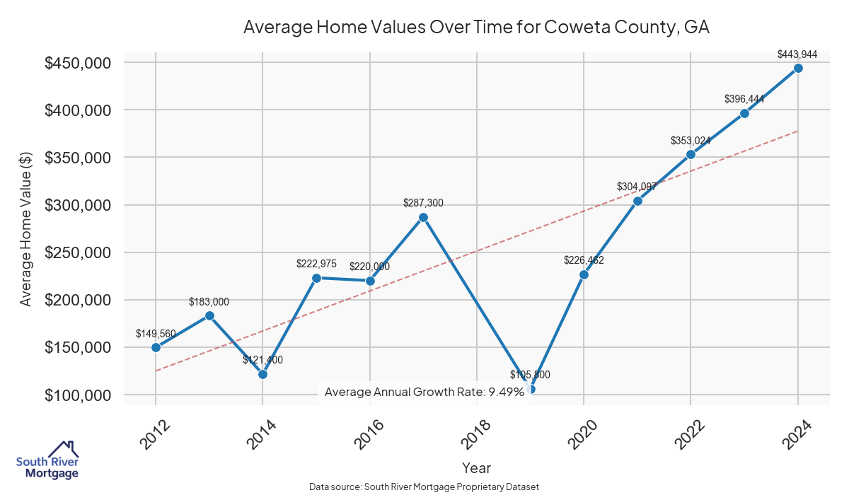 There are approximately 105 active reverse mortgage loans in Coweta County. The average interest rate in Coweta County is 7.45% for reverse mortgages. The average maximum claim amount (the lesser of the appraisal or lending limit), among reverse mortgage borrowers, in Coweta County was $385,000.00 in 2024.