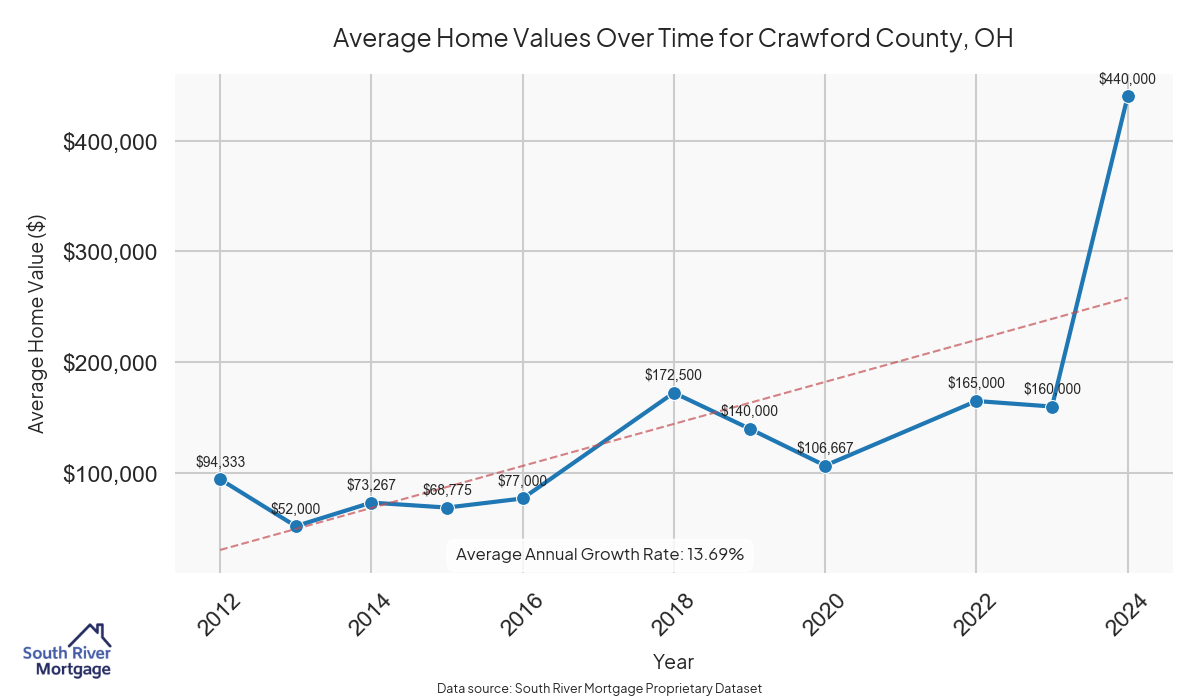 In 2024, there were 18 active reverse mortgage loans in Crawford County, Ohio. The average home value in Crawford County is $180,733.39.
