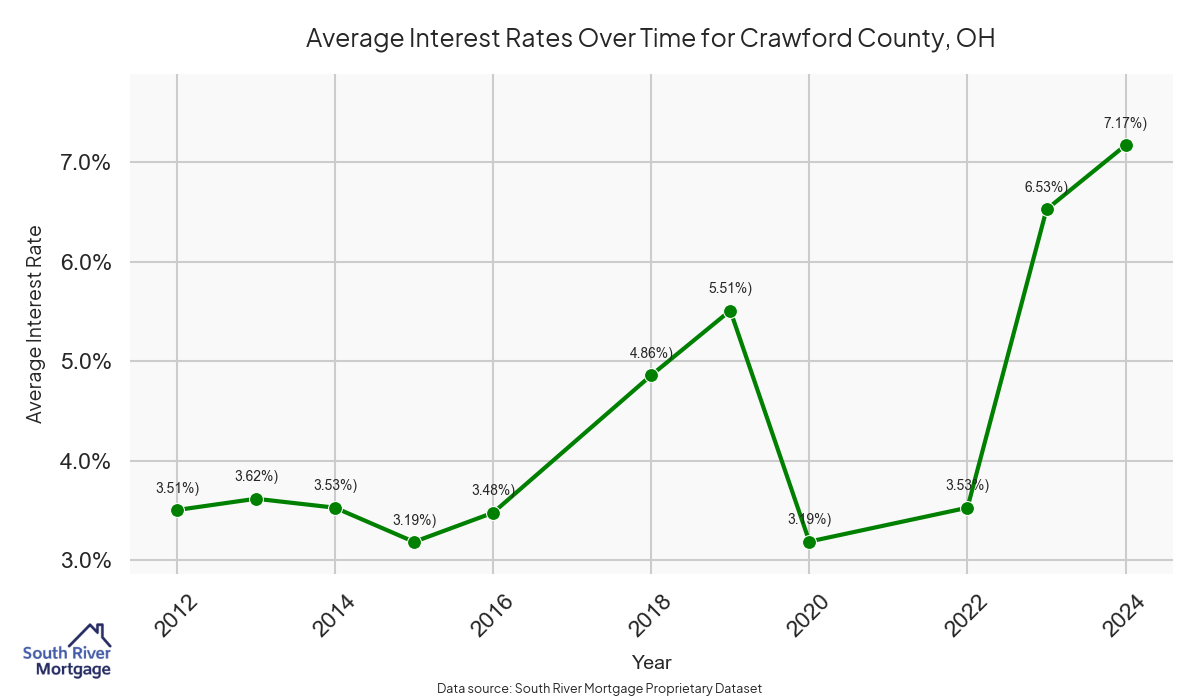 There are approximately 18 active reverse mortgage loans in Crawford County. The average interest rate in Crawford County is 8.33% for reverse mortgages. The average maximum claim amount (the lesser of the appraisal or lending limit), among reverse mortgage borrowers, in Crawford County was $251,666.67 in 2024.