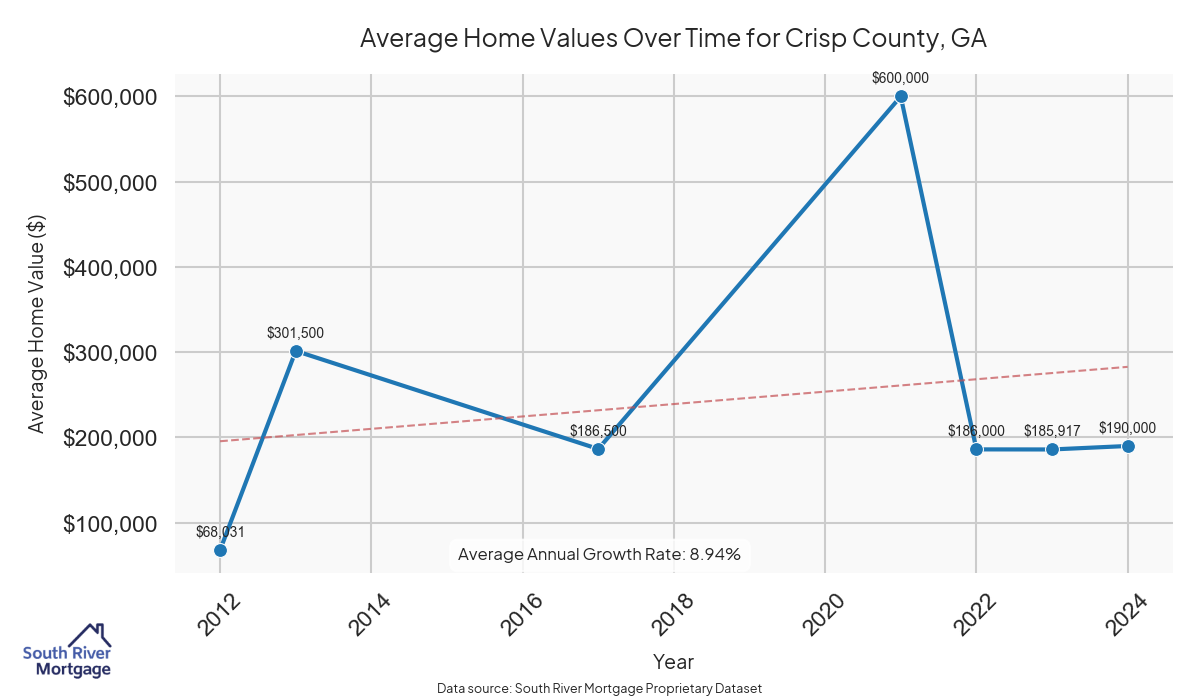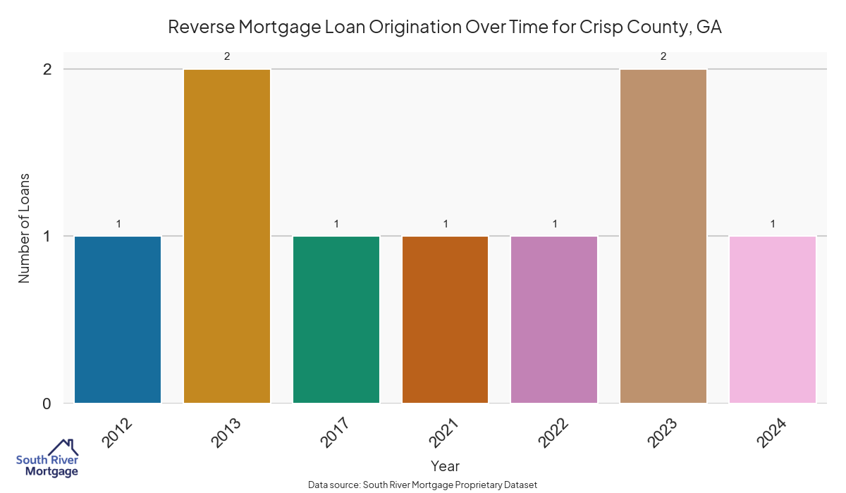 In 2024, there were 8 active reverse mortgage loans in Crisp County, Georgia. The average home value in Crisp County is $302,696.50.