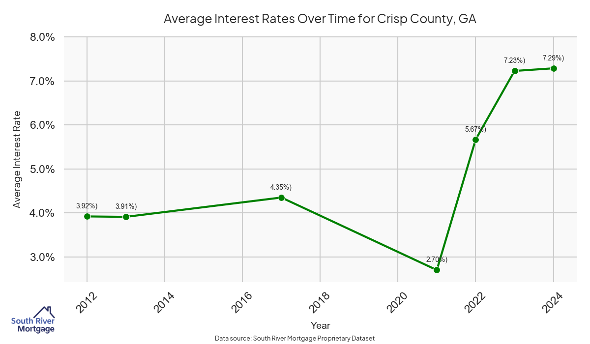 There are approximately 8 active reverse mortgage loans in Crisp County. The average interest rate in Crisp County is 7.78% for reverse mortgages. The average maximum claim amount (the lesser of the appraisal or lending limit), among reverse mortgage borrowers, in Crisp County was $240,000.00 in 2024.