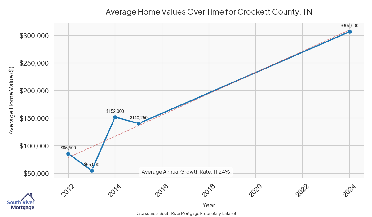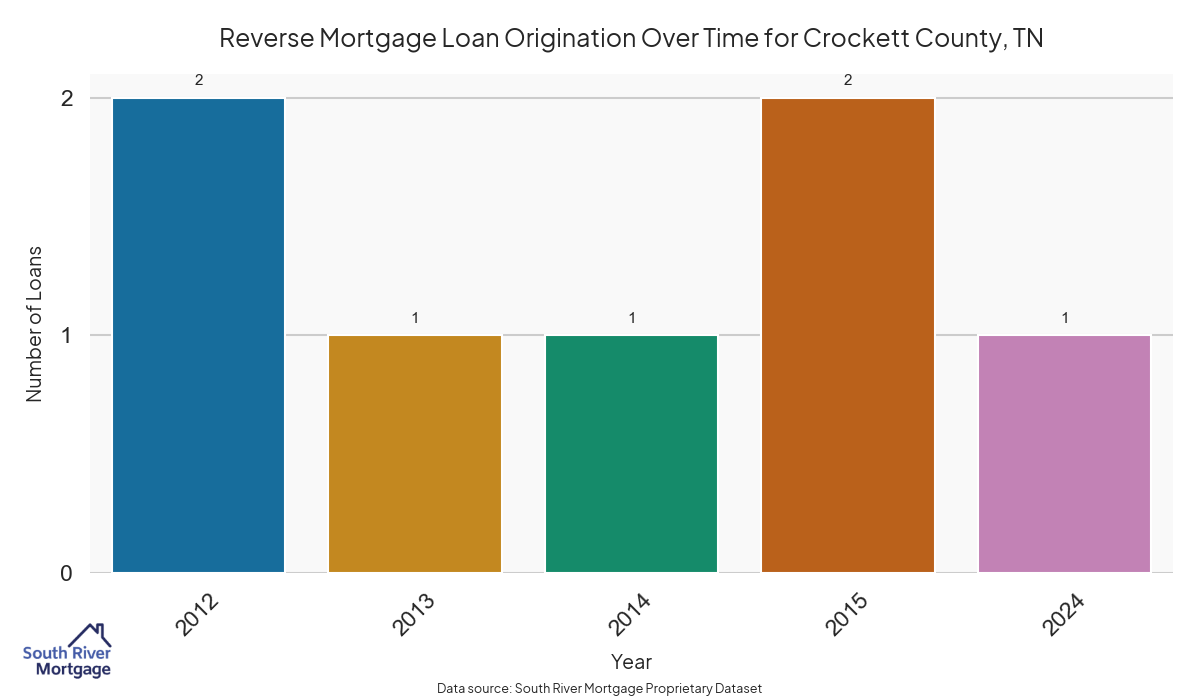 In 2024, there were 7 active reverse mortgage loans in Crockett County, Tennessee. The average home value in Crockett County is $148,238.14.