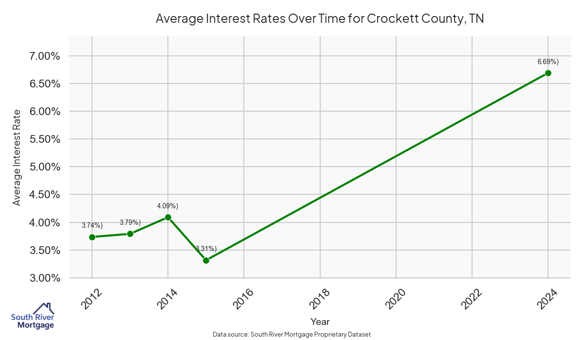 There are approximately 7 active reverse mortgage loans in Crockett County. The average interest rate in Crockett County is 6.69% for reverse mortgages. The average maximum claim amount (the lesser of the appraisal or lending limit), among reverse mortgage borrowers, in Crockett County was $195,000.00 in 2024.