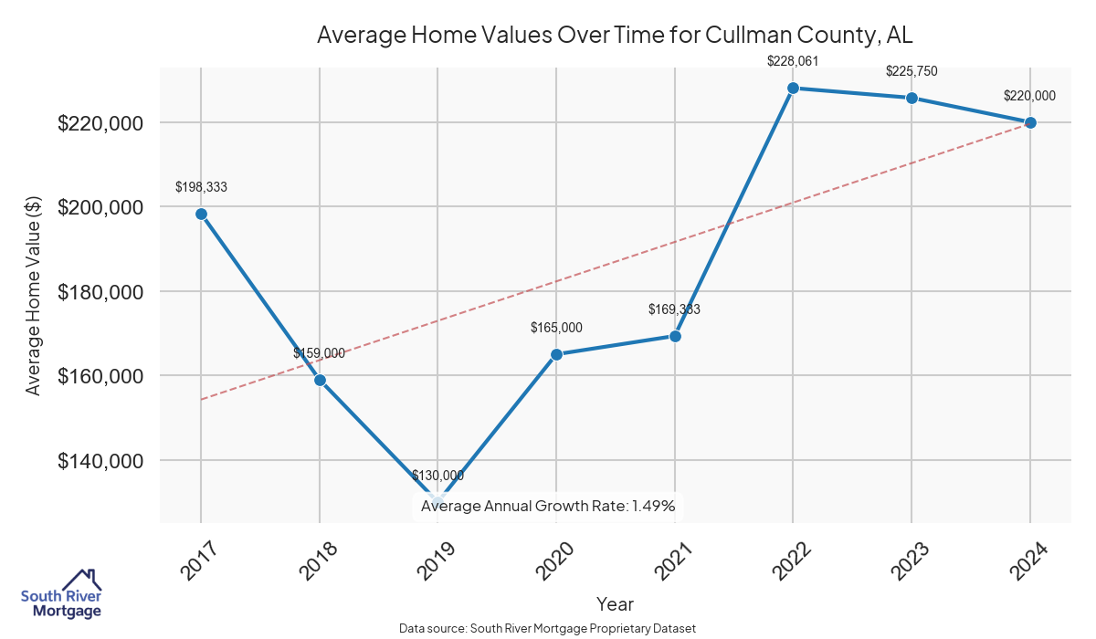 In 2024, there were 24 active reverse mortgage loans in Cullman County, Alabama. The average home value in Cullman County is $228,021.33.