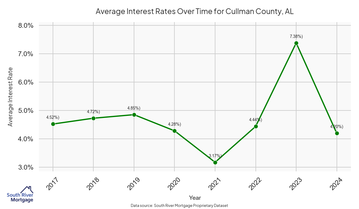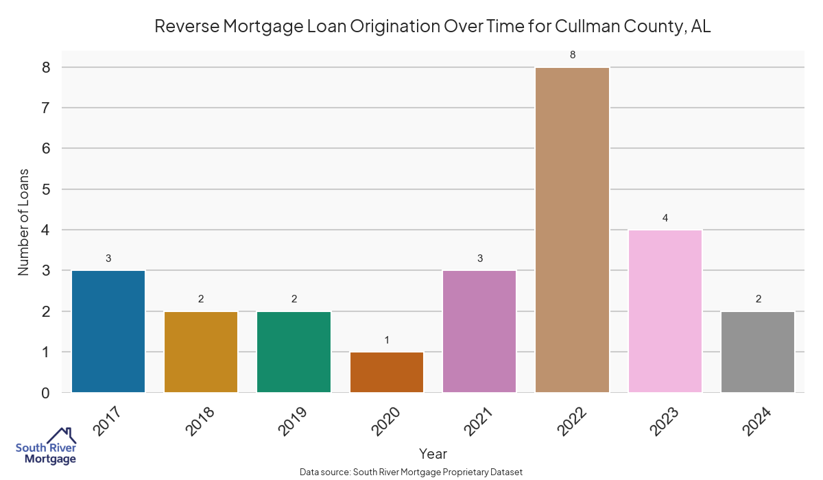 There are approximately 24 active reverse mortgage loans in Cullman County. The average interest rate in Cullman County is 7.7% for reverse mortgages. The average maximum claim amount (the lesser of the appraisal or lending limit), among reverse mortgage borrowers, in Cullman County was $218,333.33 in 2024.