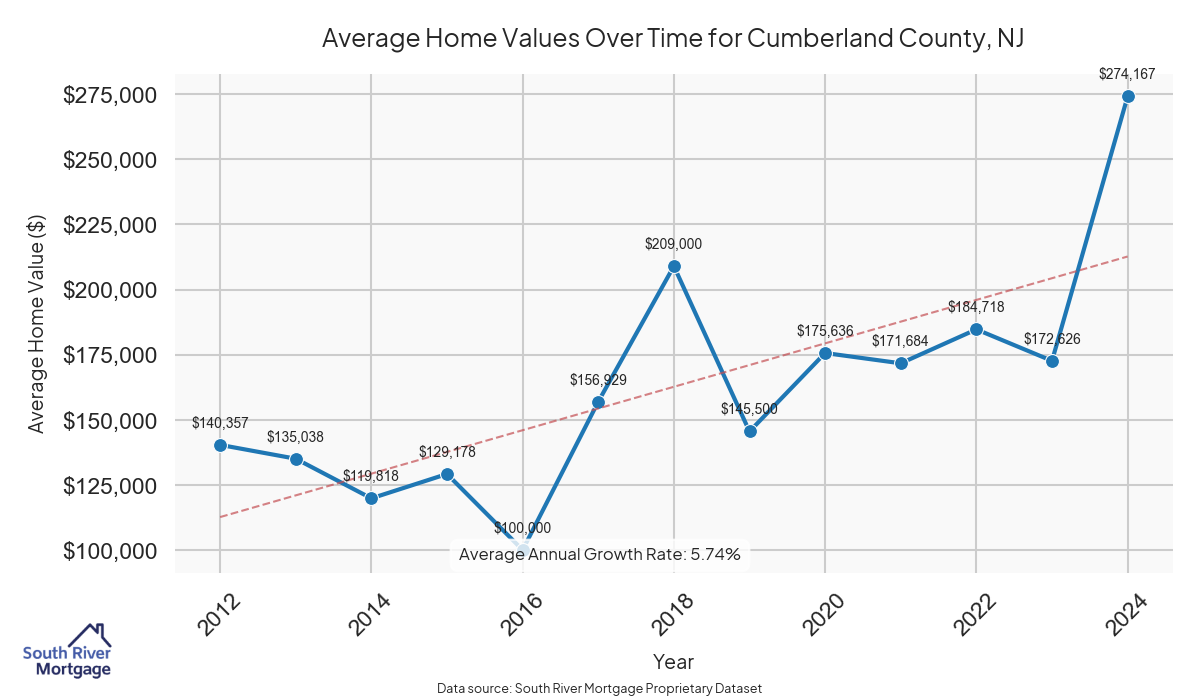 In 2024, there were 54 active reverse mortgage loans in Cumberland County, New Jersey. The average home value in Cumberland County is $284,466.76.