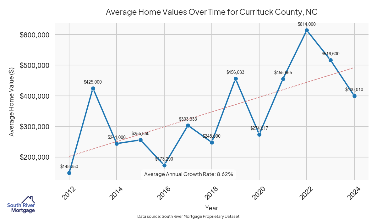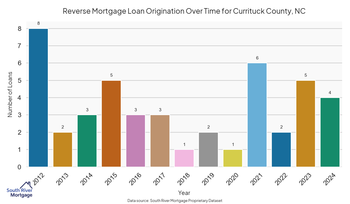 In 2024, there were 42 active reverse mortgage loans in Currituck County, North Carolina. The average home value in Currituck County is $622,835.62.