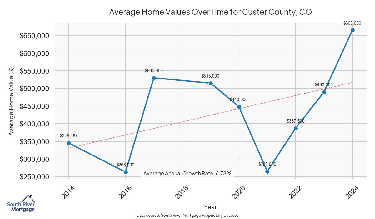 In 2024, there were 20 active reverse mortgage loans in Custer County, Colorado. The average home value in Custer County is $540,075.20.