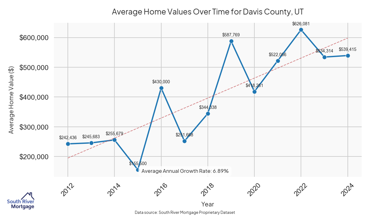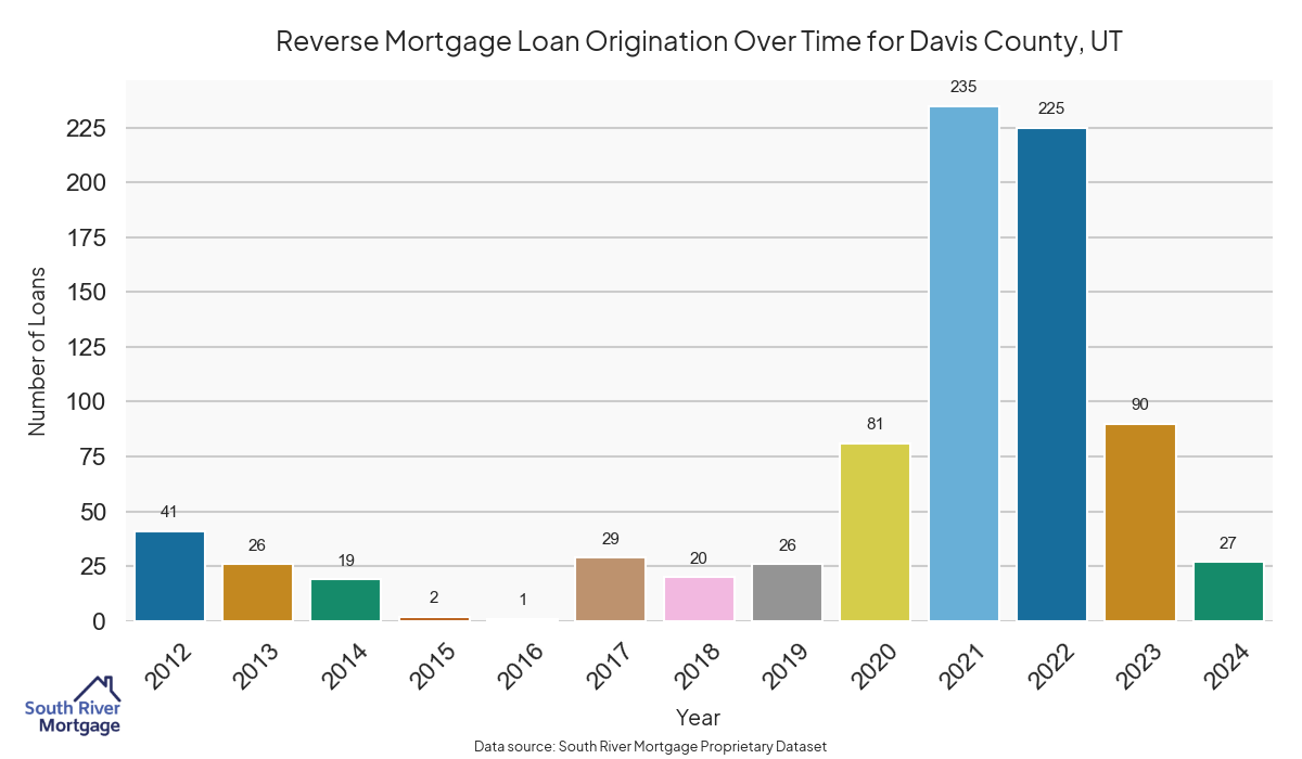 In 2024, there were 812 active reverse mortgage loans in Davis County, Utah. The average home value in Davis County is $589,369.02.