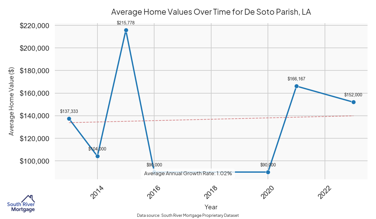 In 2024, there were 15 active reverse mortgage loans in De Soto Parish, Louisiana. The average home value in De Soto Parish is $135,352.53.
