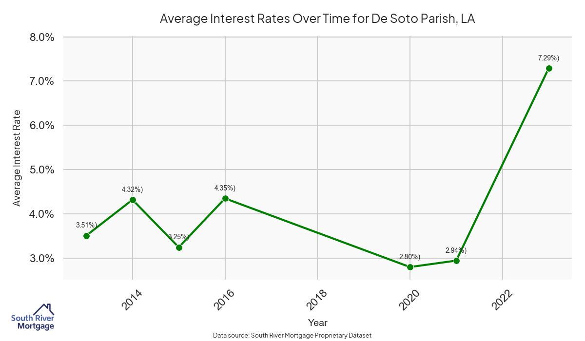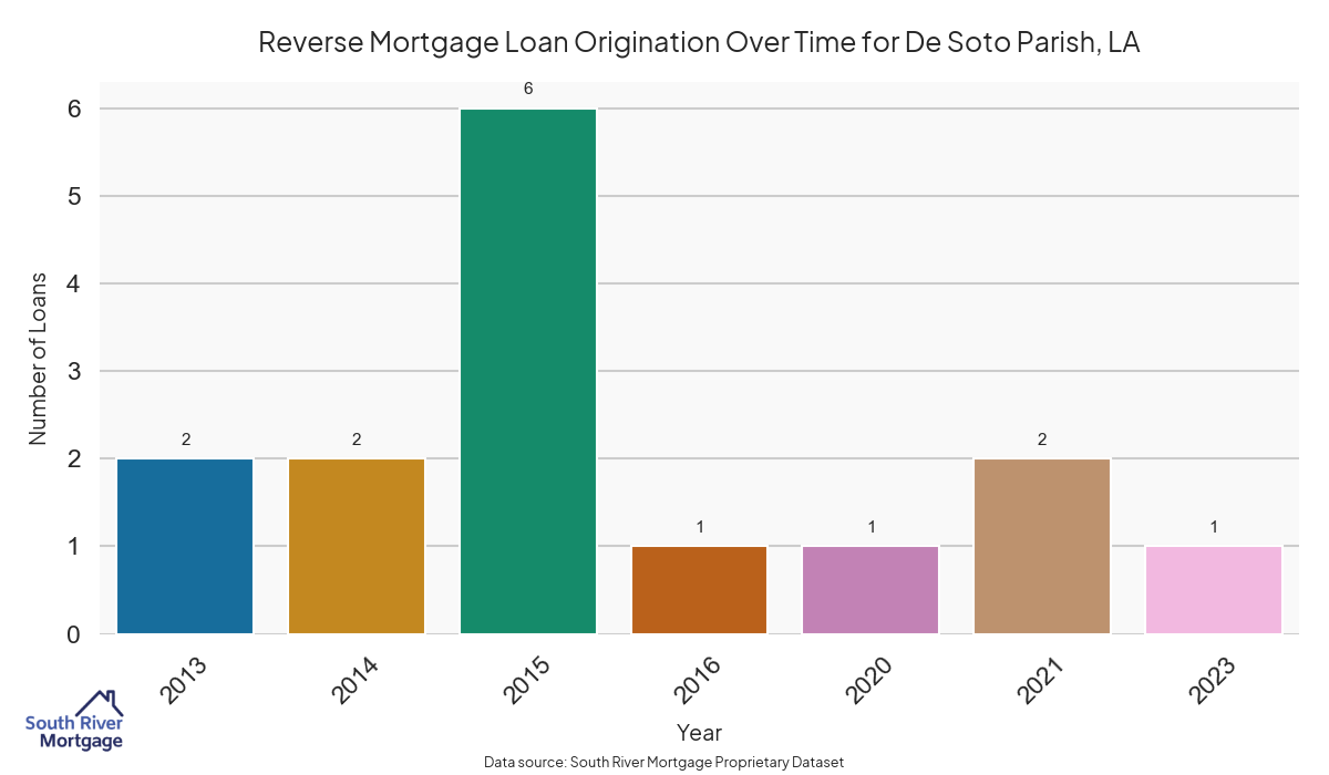 There are approximately 15 active reverse mortgage loans in De Soto Parish. The average interest rate in De Soto Parish is 7.55% for reverse mortgages. The average maximum claim amount (the lesser of the appraisal or lending limit), among reverse mortgage borrowers, in De Soto Parish was $205,000.00 in 2024.