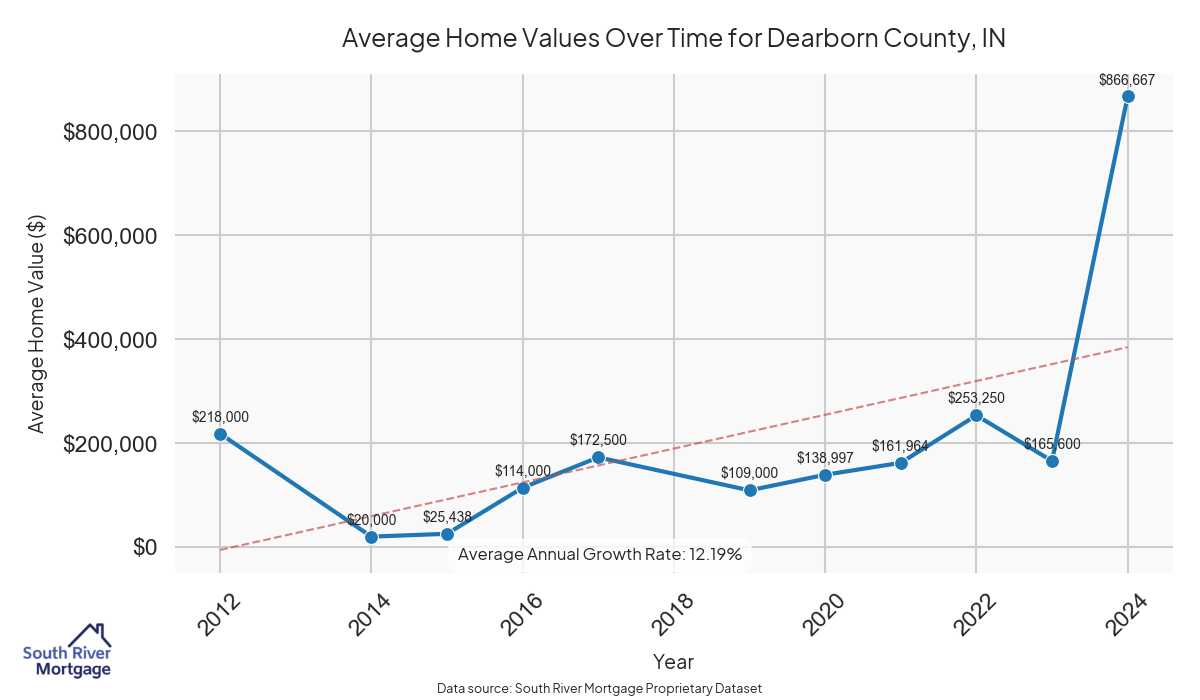 In 2024, there were 35 active reverse mortgage loans in Dearborn County, Indiana. The average home value in Dearborn County is $295,822.00.