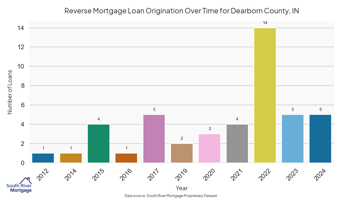 There are approximately 35 active reverse mortgage loans in Dearborn County. The average interest rate in Dearborn County is 7.46% for reverse mortgages. The average maximum claim amount (the lesser of the appraisal or lending limit), among reverse mortgage borrowers, in Dearborn County was $255,000.00 in 2024.