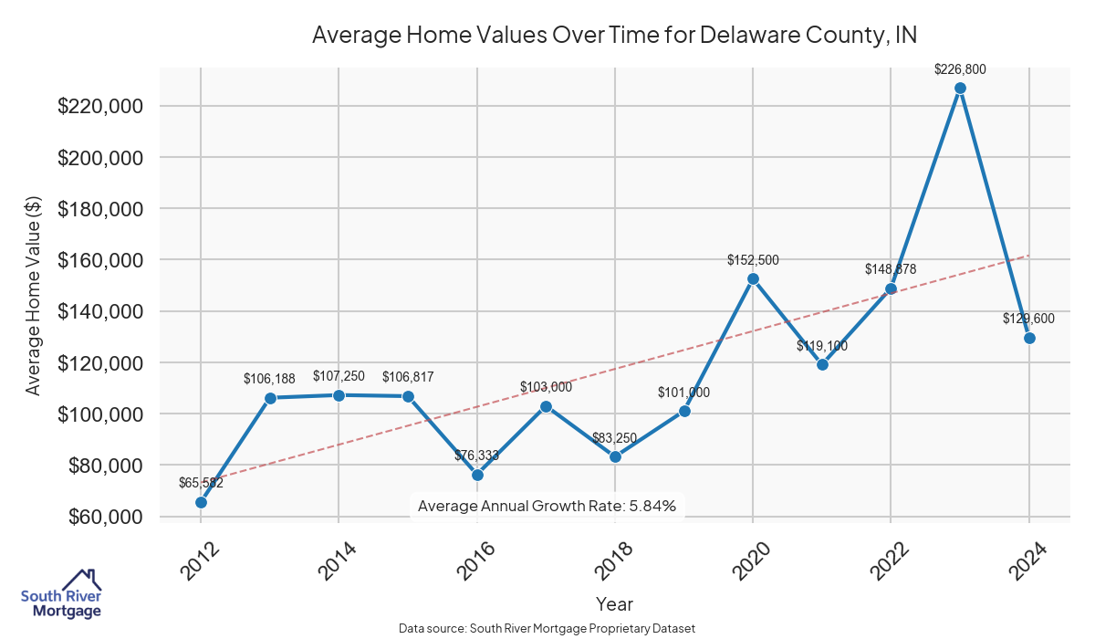 In 2024, there were 75 active reverse mortgage loans in Delaware County, Indiana. The average home value in Delaware County is $188,245.15.