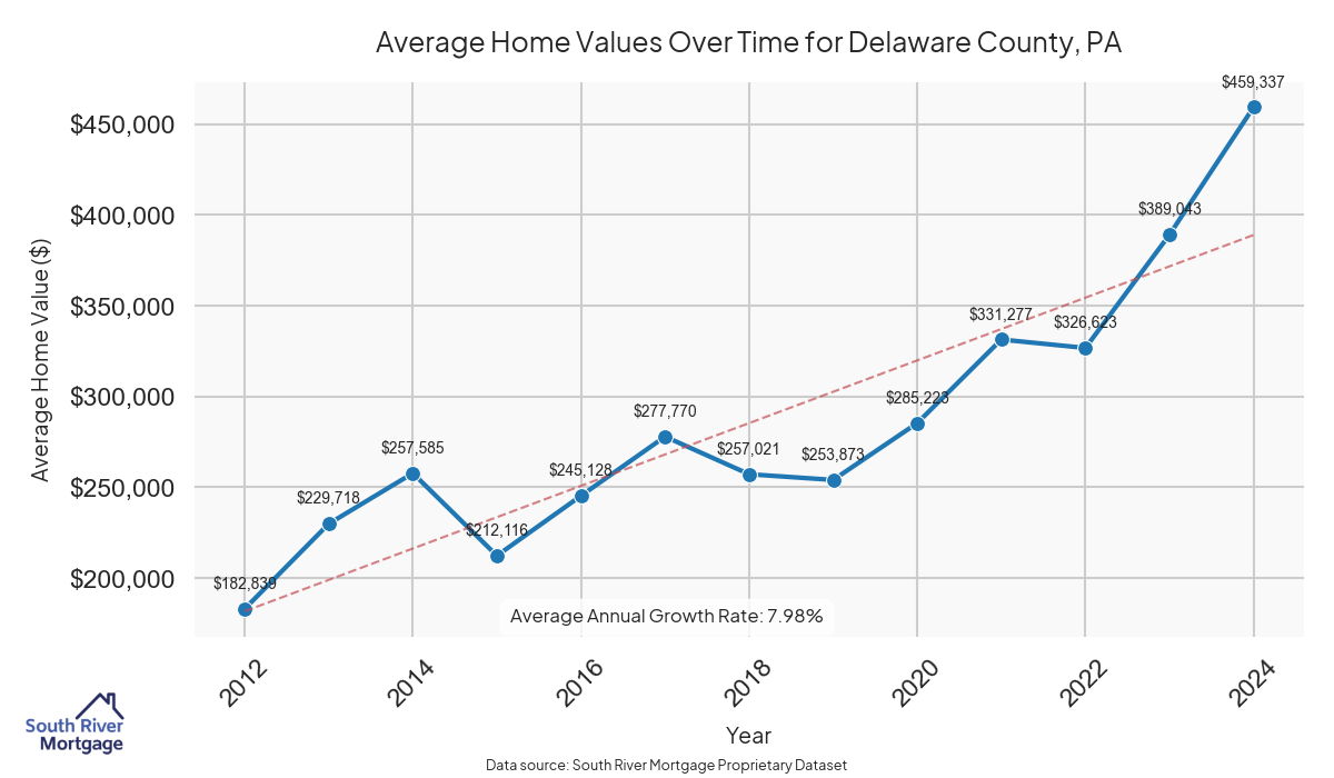 In 2024, there were 453 active reverse mortgage loans in Delaware County, Pennsylvania. The average home value in Delaware County is $434,456.41.