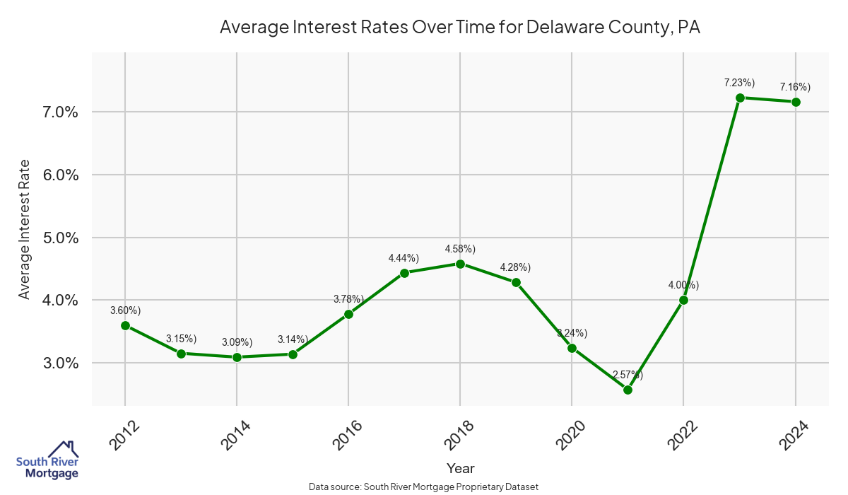 There are approximately 453 active reverse mortgage loans in Delaware County. The average interest rate in Delaware County is 7.37% for reverse mortgages. The average maximum claim amount (the lesser of the appraisal or lending limit), among reverse mortgage borrowers, in Delaware County was $442,297.30 in 2024.