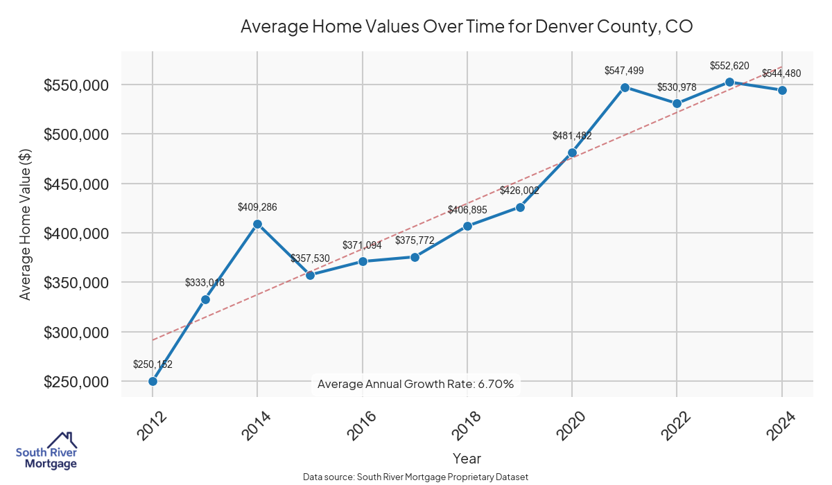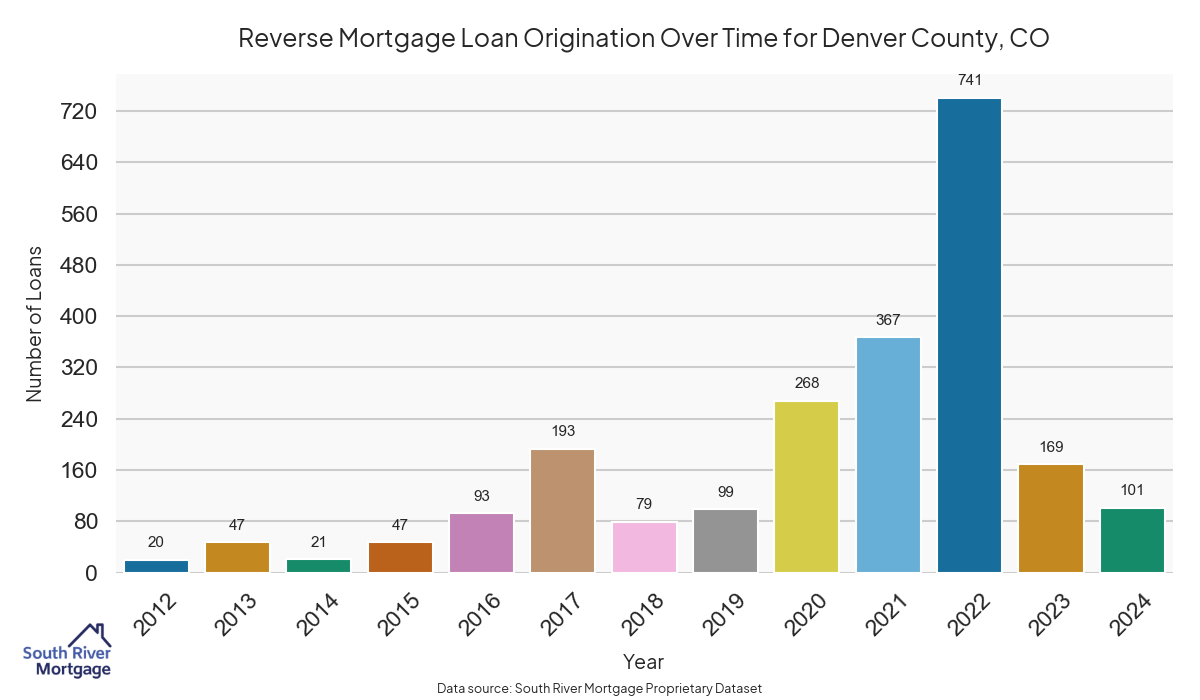 In 2024, there were 2240 active reverse mortgage loans in Denver County, Colorado. The average home value in Denver County is $656,467.58.