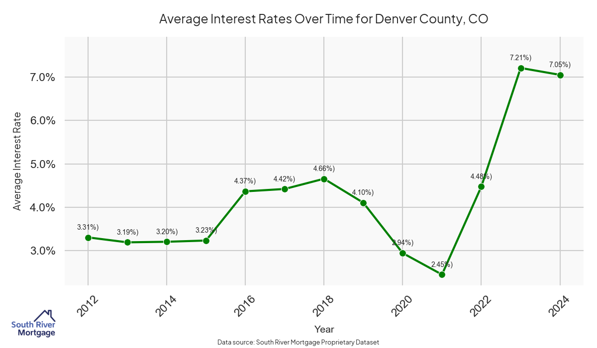 There are approximately 2240 active reverse mortgage loans in Denver County. The average interest rate in Denver County is 7.34% for reverse mortgages. The average maximum claim amount (the lesser of the appraisal or lending limit), among reverse mortgage borrowers, in Denver County was $634,574.47 in 2024.