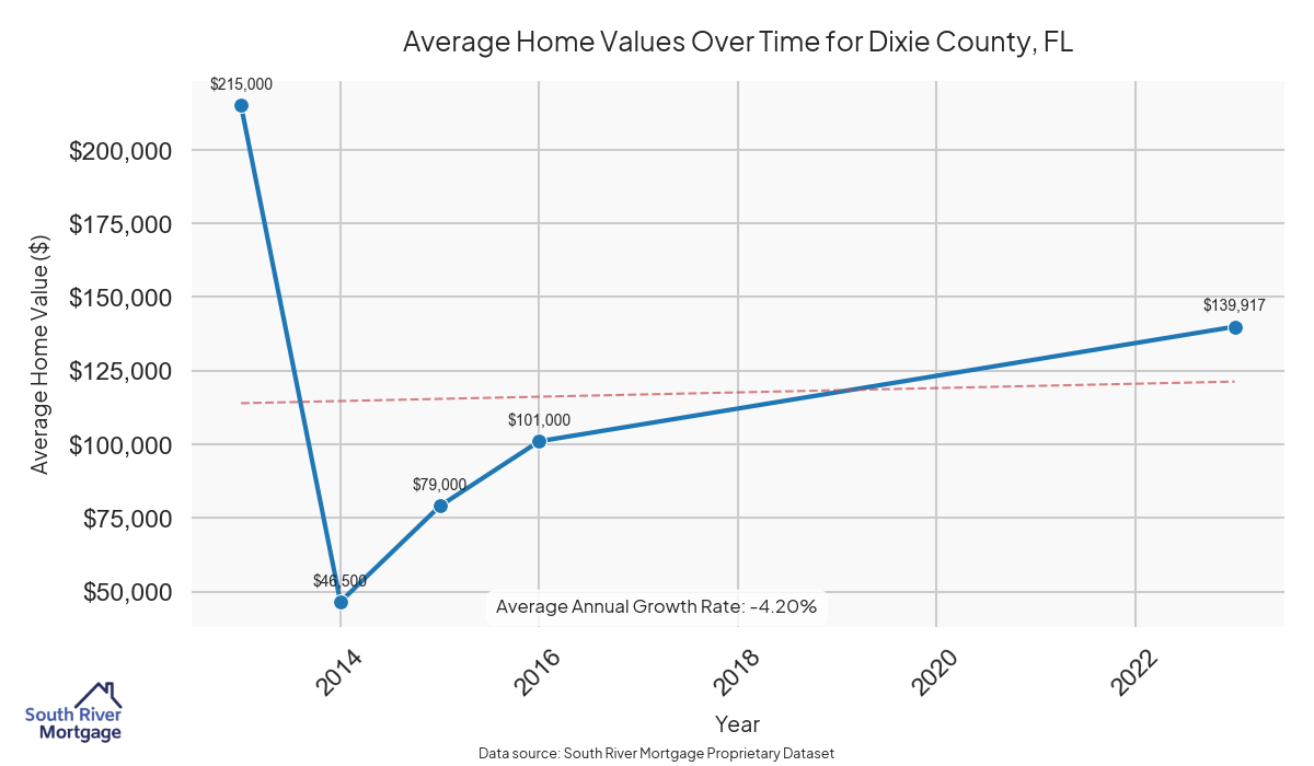 In 2024, there were 10 active reverse mortgage loans in Dixie County, Florida. The average home value in Dixie County is $117,215.20.