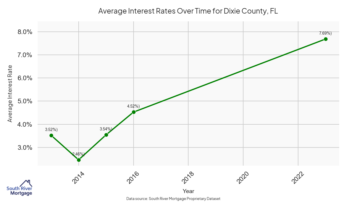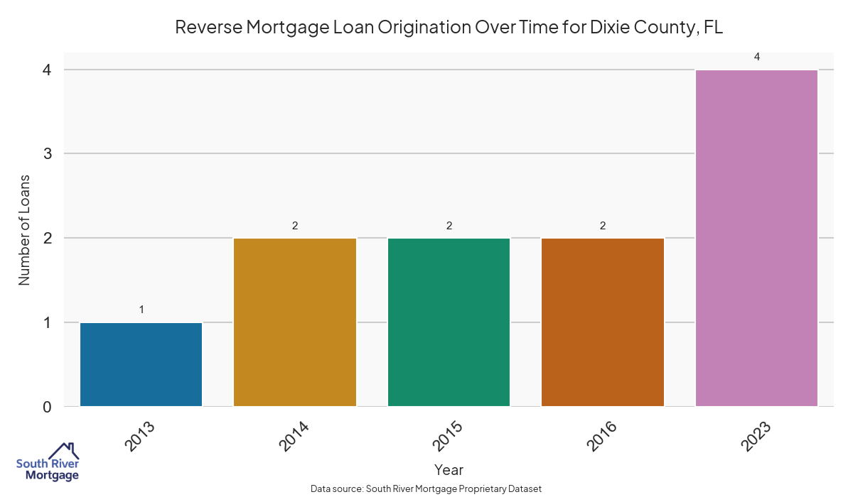 There are approximately 10 active reverse mortgage loans in Dixie County. The average interest rate in Dixie County is 8.0% for reverse mortgages. The average maximum claim amount (the lesser of the appraisal or lending limit), among reverse mortgage borrowers, in Dixie County was $173,000.00 in 2024.
