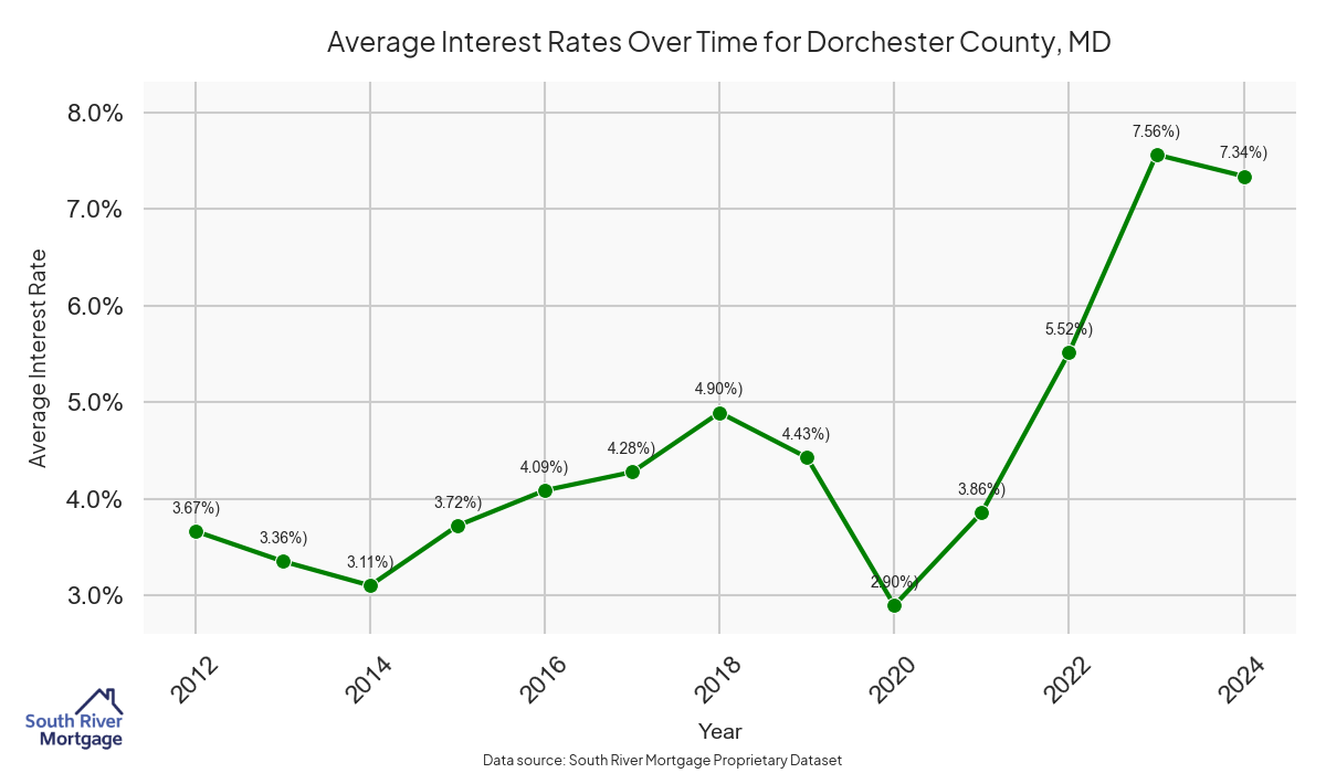 There are approximately 55 active reverse mortgage loans in Dorchester County. The average interest rate in Dorchester County is 7.99% for reverse mortgages. The average maximum claim amount (the lesser of the appraisal or lending limit), among reverse mortgage borrowers, in Dorchester County was $335,000.00 in 2024.
