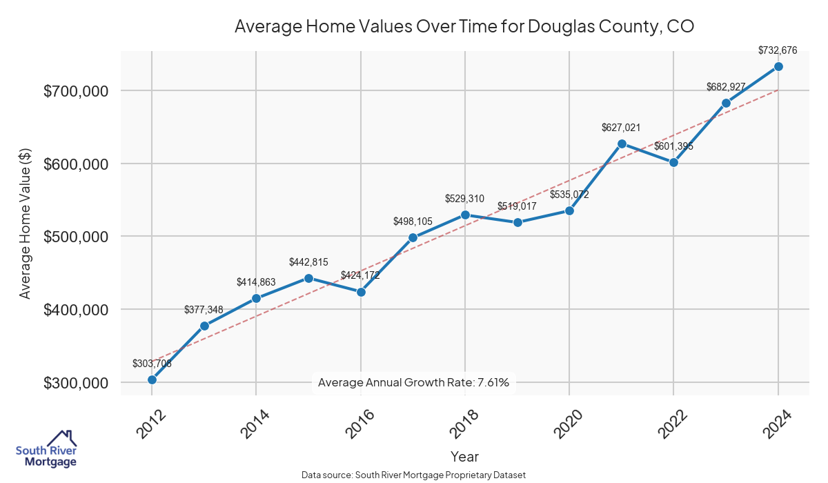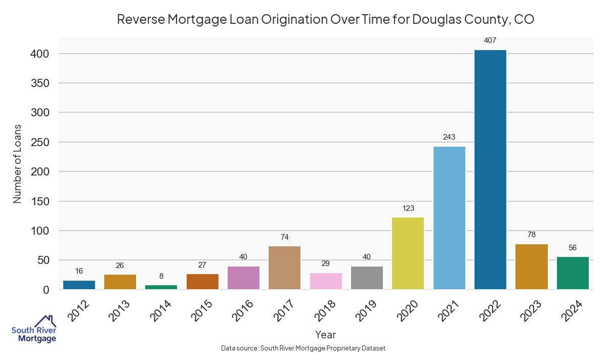 In 2024, there were 1166 active reverse mortgage loans in Douglas County, Colorado. The average home value in Douglas County is $755,430.83.