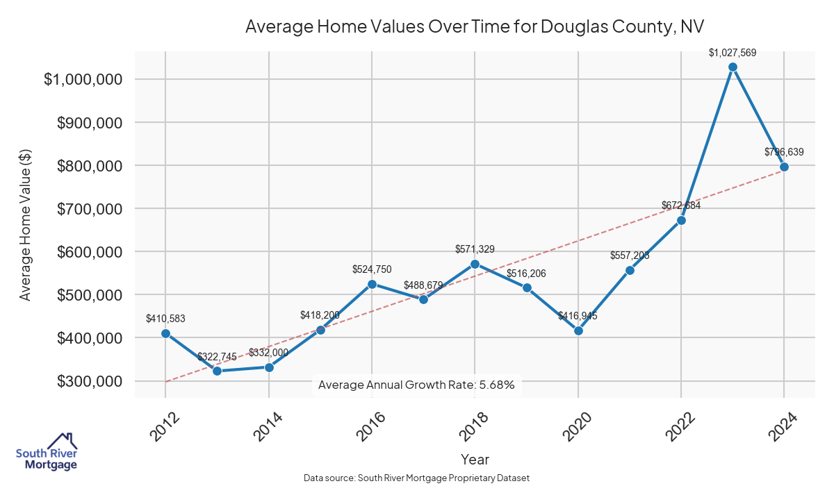 In 2024, there were 223 active reverse mortgage loans in Douglas County, Nevada. The average home value in Douglas County is $856,168.34.