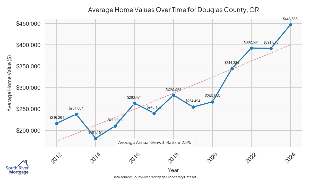 Douglas County, located in the state of Oregon, is a charming region known for its natural beauty and outdoor recreational opportunities. With a population of approximately 110,980 residents, the county enjoys a mild climate with warm summers and cool winters. The area is renowned for its stunning landscapes, including the iconic Umpqua National Forest and the picturesque Umpqua River. Historically, Douglas County has a rich heritage dating back to the pioneering days of the Oregon Trail. The county is home to several historical sites, such as the preserved Fort Umpqua and the Douglas County Museum. Additionally, Douglas County is known for its vibrant arts and cultural scene, with numerous galleries and events throughout the year. For seniors looking to supplement their retirement income, the average home value of $398,561.65, combined with the average property tax of $2,549.05 and the average interest rate of 4.39%, make Douglas County an attractive location for exploring options like reverse mortgages to unlock the equity in their homes.