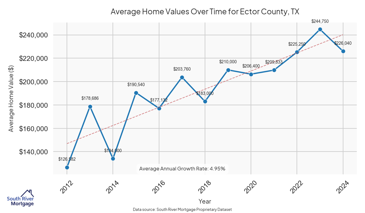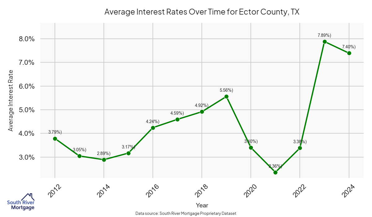 There are approximately 74 active reverse mortgage loans in Ector County. The average interest rate in Ector County is 7.81% for reverse mortgages. The average maximum claim amount (the lesser of the appraisal or lending limit), among reverse mortgage borrowers, in Ector County was $247,000.00 in 2024.