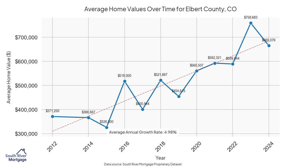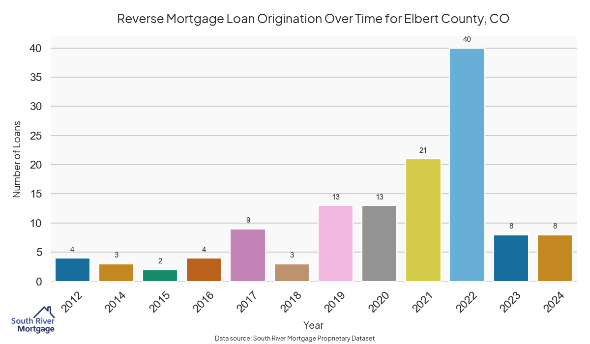 In 2024, there were 125 active reverse mortgage loans in Elbert County, Colorado. The average home value in Elbert County is $742,837.87.