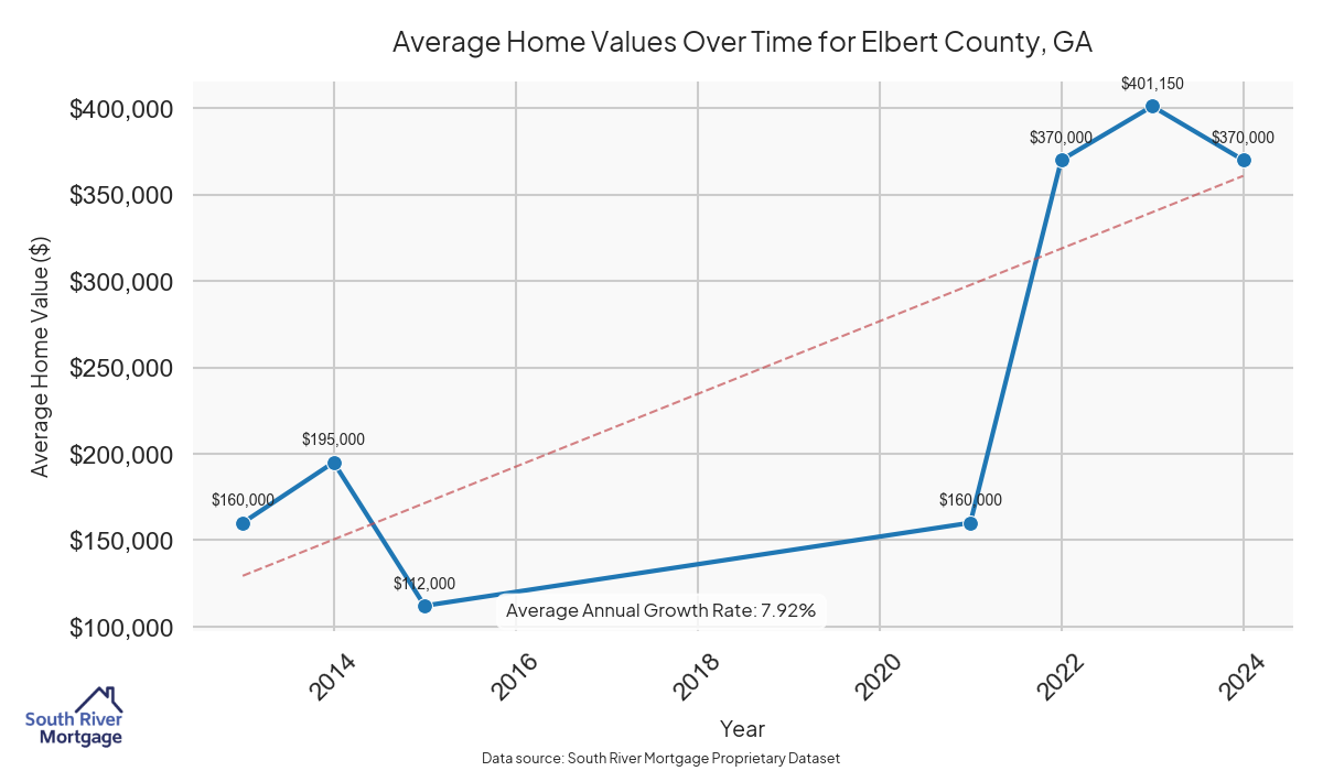 In 2024, there were 10 active reverse mortgage loans in Elbert County, Georgia. The average home value in Elbert County is $298,766.30.