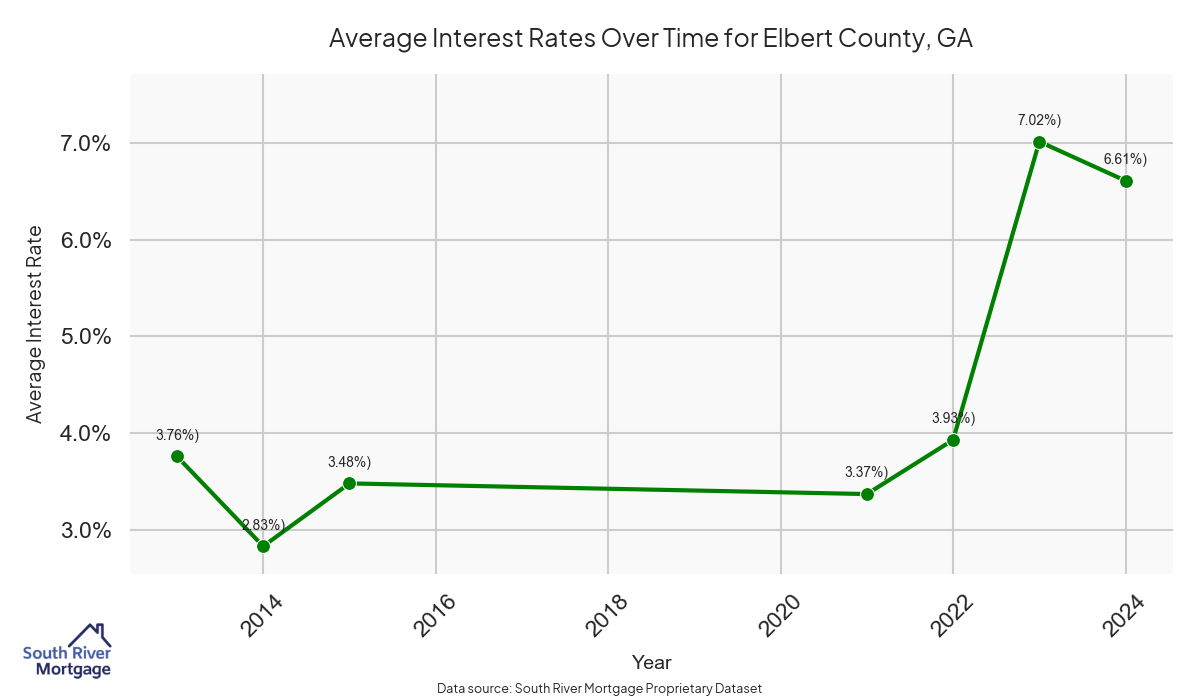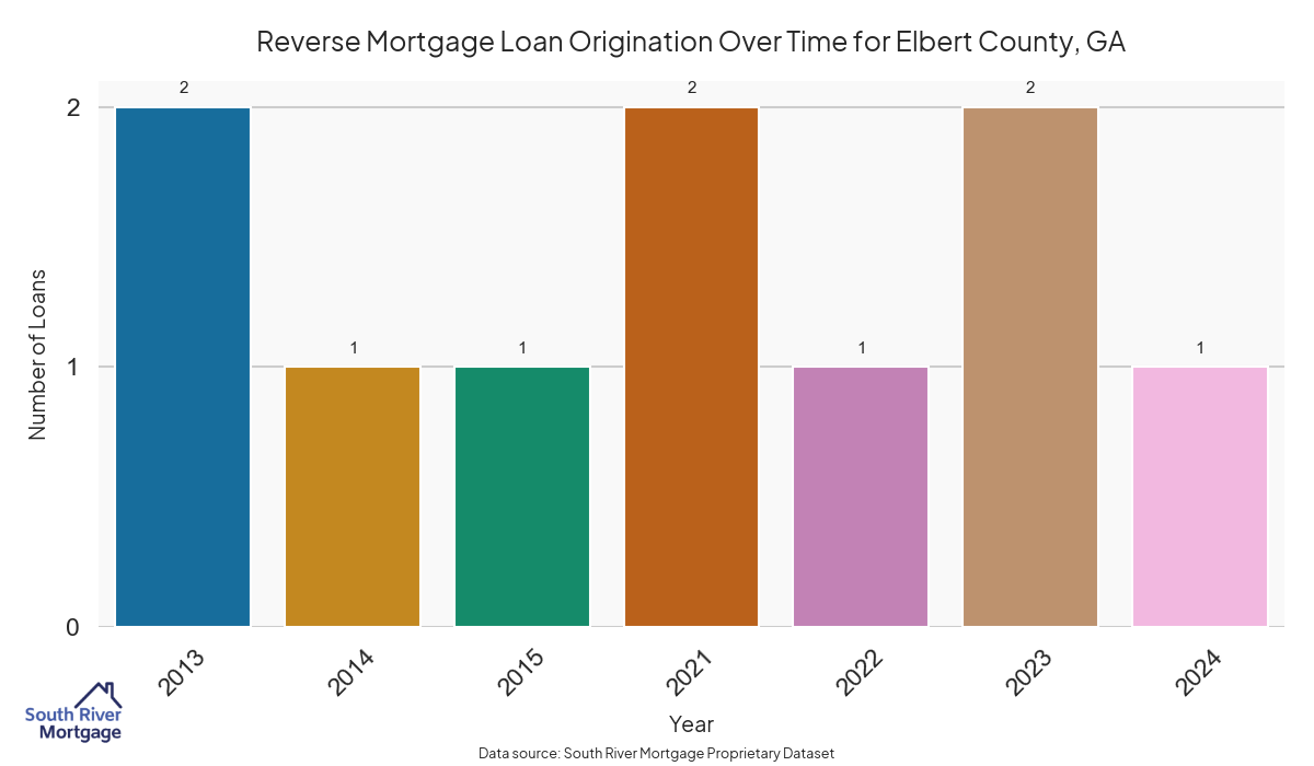 There are approximately 10 active reverse mortgage loans in Elbert County. The average interest rate in Elbert County is 8.01% for reverse mortgages. The average maximum claim amount (the lesser of the appraisal or lending limit), among reverse mortgage borrowers, in Elbert County was $265,000.00 in 2024.