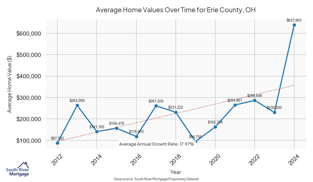 In 2024, there were 56 active reverse mortgage loans in Erie County, Ohio. The average home value in Erie County is $306,203.68.