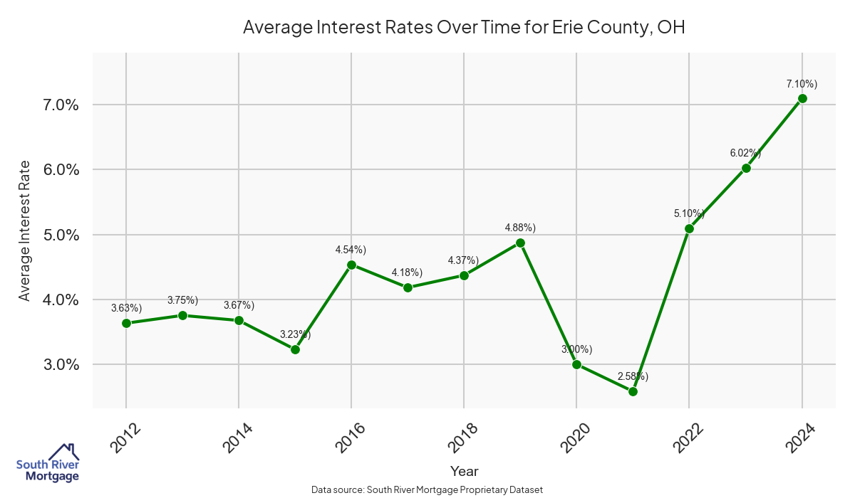 There are approximately 56 active reverse mortgage loans in Erie County. The average interest rate in Erie County is 6.91% for reverse mortgages. The average maximum claim amount (the lesser of the appraisal or lending limit), among reverse mortgage borrowers, in Erie County was $565,000.00 in 2024.