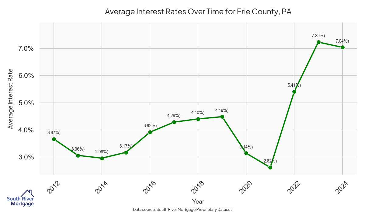 There are approximately 122 active reverse mortgage loans in Erie County. The average interest rate in Erie County is 7.58% for reverse mortgages. The average maximum claim amount (the lesser of the appraisal or lending limit), among reverse mortgage borrowers, in Erie County was $200,714.29 in 2024.