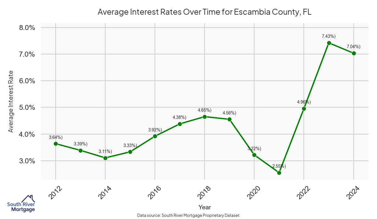 There are approximately 372 active reverse mortgage loans in Escambia County. The average interest rate in Escambia County is 7.47% for reverse mortgages. The average maximum claim amount (the lesser of the appraisal or lending limit), among reverse mortgage borrowers, in Escambia County was $256,621.62 in 2024.