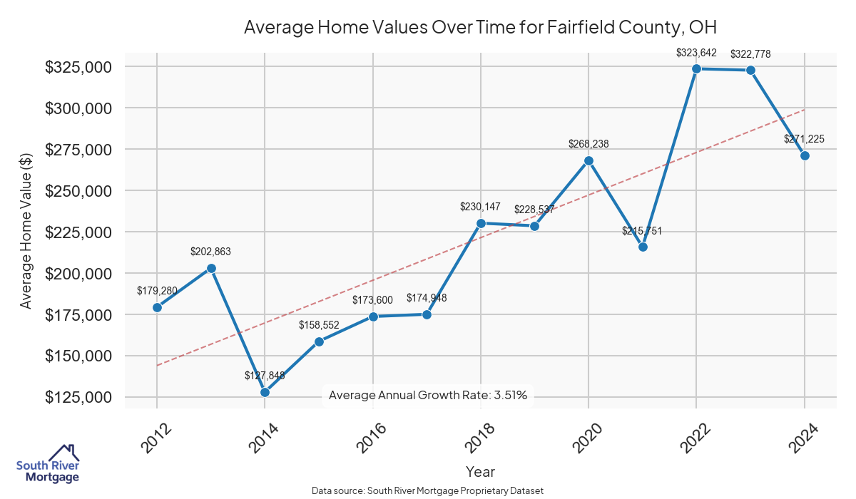 In 2024, there were 108 active reverse mortgage loans in Fairfield County, Ohio. The average home value in Fairfield County is $352,742.40.