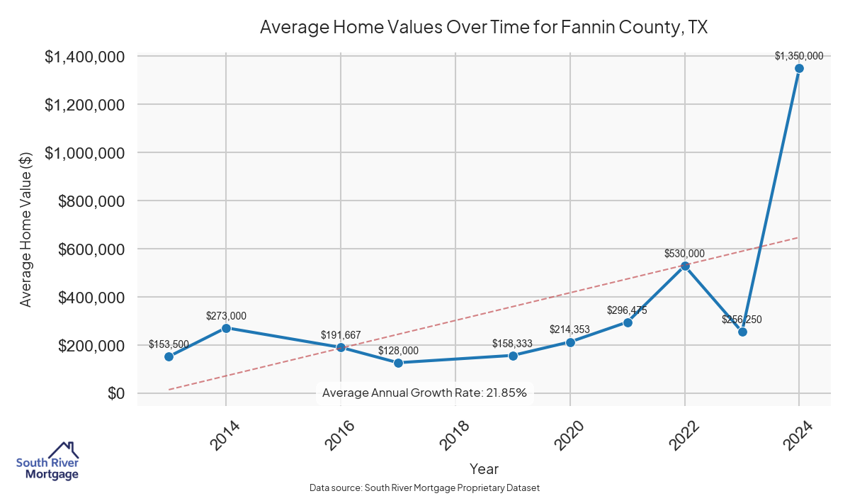 There are approximately 25 active reverse mortgage loans in Fannin County. The average interest rate in Fannin County is 7.93% for reverse mortgages. The average maximum claim amount (the lesser of the appraisal or lending limit), among reverse mortgage borrowers, in Fannin County was $251,666.67 in 2024.