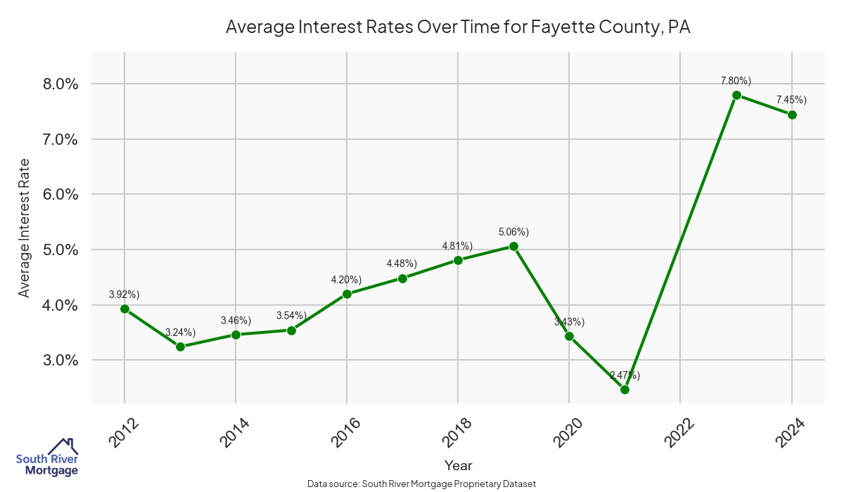 There are approximately 61 active reverse mortgage loans in Fayette County. The average interest rate in Fayette County is 7.68% for reverse mortgages. The average maximum claim amount (the lesser of the appraisal or lending limit), among reverse mortgage borrowers, in Fayette County was $239,285.71 in 2024.