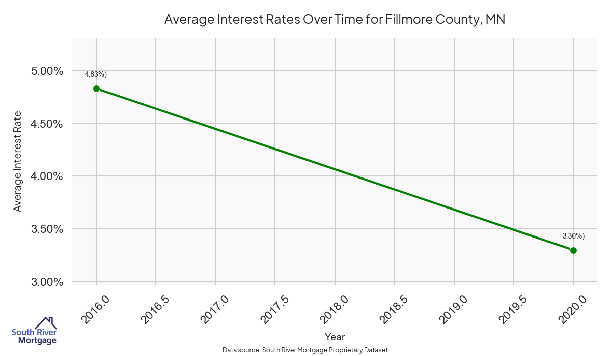 There are approximately 2 active reverse mortgage loans in Fillmore County. The average interest rate in Fillmore County is 7.76% for reverse mortgages. The average maximum claim amount (the lesser of the appraisal or lending limit), among reverse mortgage borrowers, in Fillmore County was $75,000.00 in 2024.