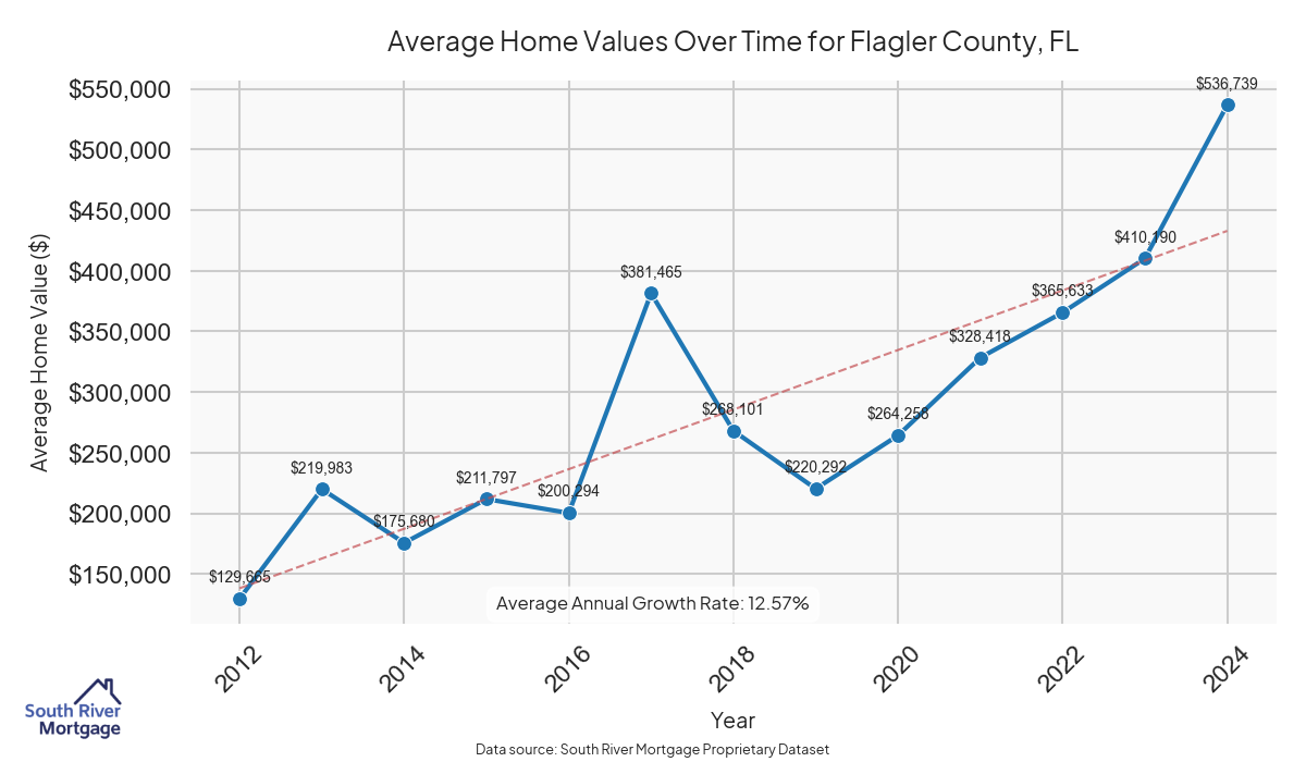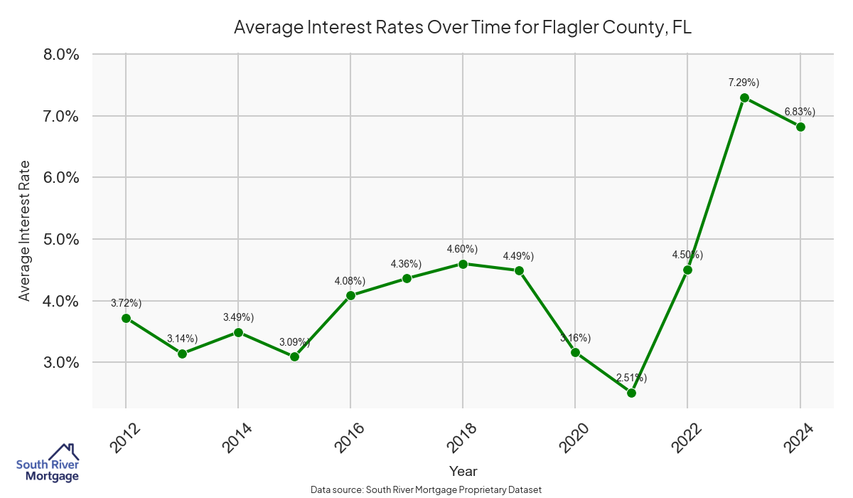 There are approximately 354 active reverse mortgage loans in Flagler County. The average interest rate in Flagler County is 7.35% for reverse mortgages. The average maximum claim amount (the lesser of the appraisal or lending limit), among reverse mortgage borrowers, in Flagler County was $434,821.43 in 2024.