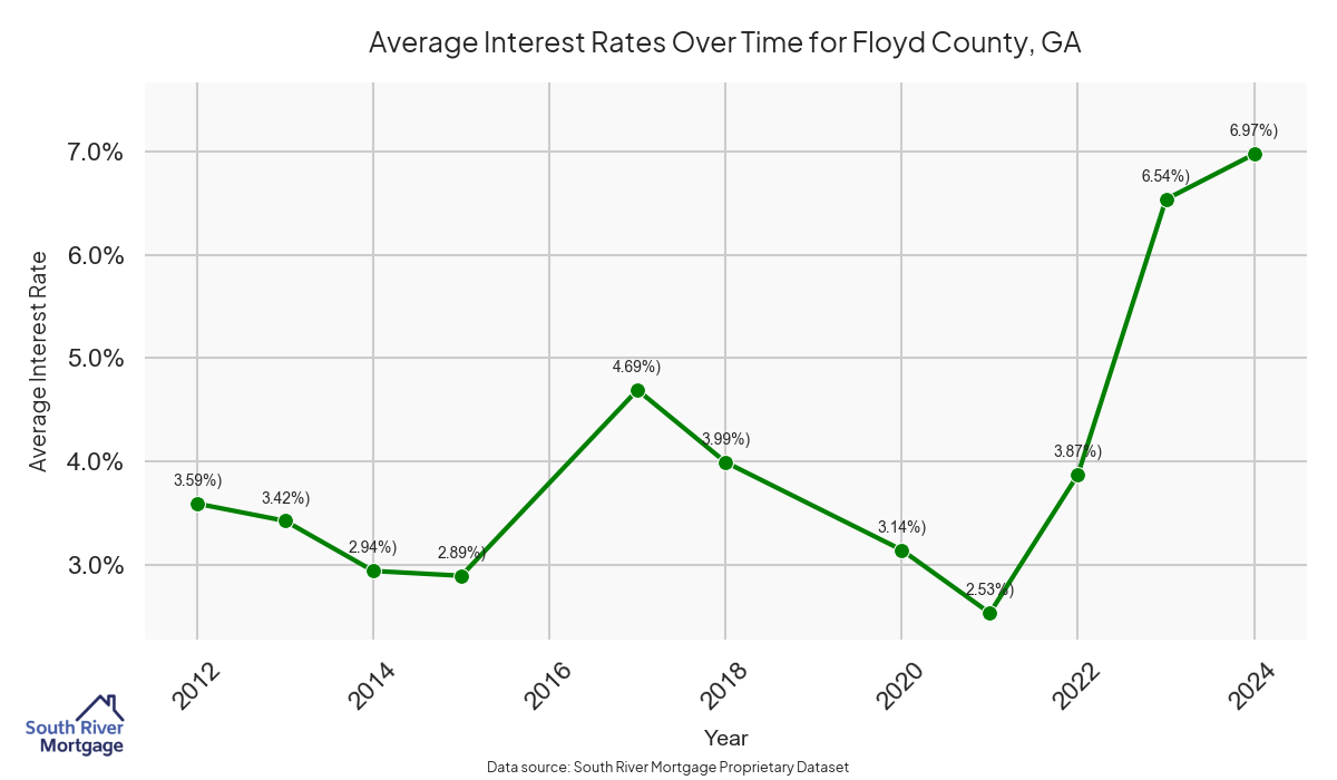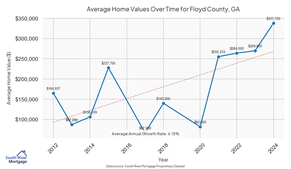 In 2024, there were 55 active reverse mortgage loans in Floyd County, Georgia. The average home value in Floyd County is $250,782.64.