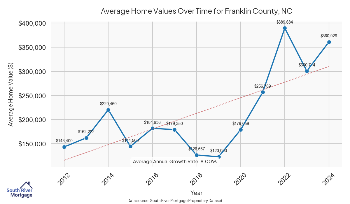 In 2024, there were 62 active reverse mortgage loans in Franklin County, North Carolina. The average home value in Franklin County is $372,598.69.