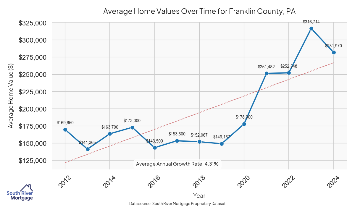 In 2024, there were 114 active reverse mortgage loans in Franklin County, Pennsylvania. The average home value in Franklin County is $285,690.08.