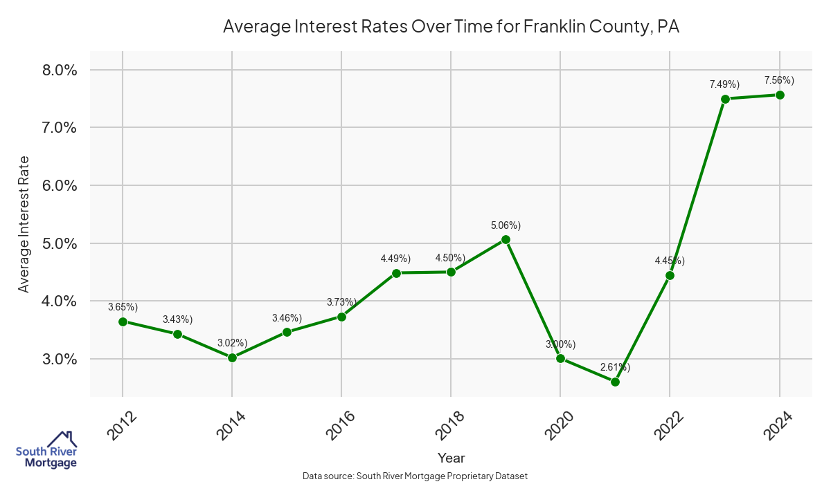 There are approximately 114 active reverse mortgage loans in Franklin County. The average interest rate in Franklin County is 8.05% for reverse mortgages. The average maximum claim amount (the lesser of the appraisal or lending limit), among reverse mortgage borrowers, in Franklin County was $266,538.46 in 2024.
