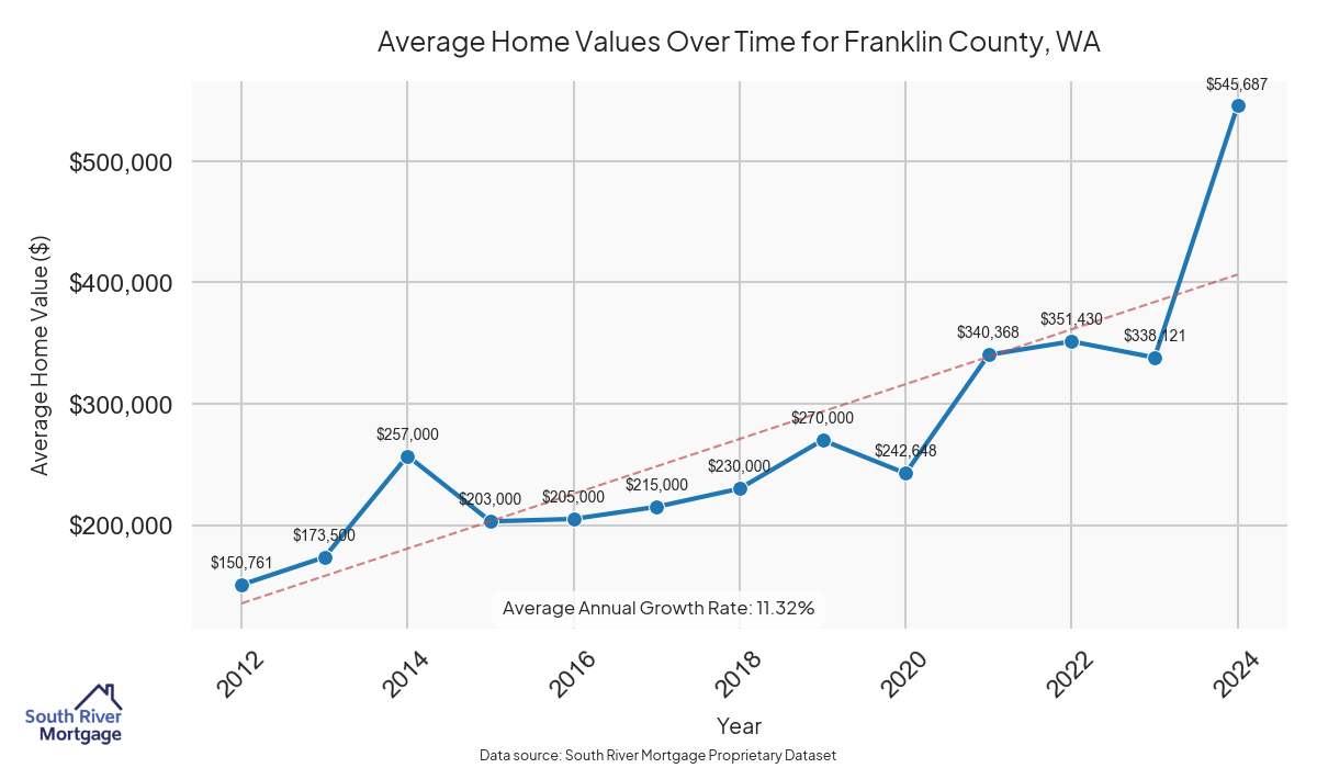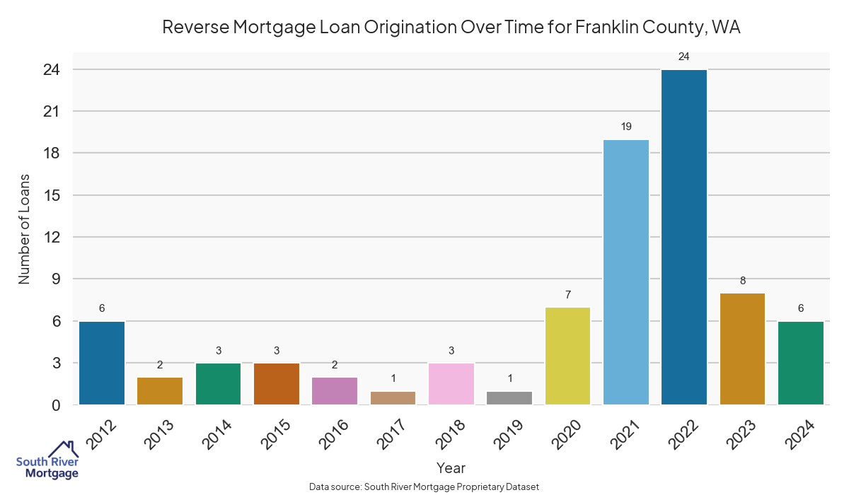 In 2024, there were 85 active reverse mortgage loans in Franklin County, Washington. The average home value in Franklin County is $430,930.47.