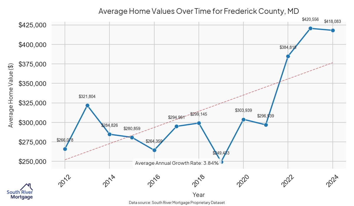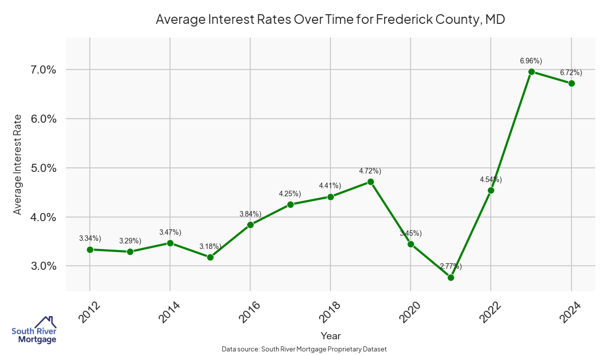 There are approximately 232 active reverse mortgage loans in Frederick County. The average interest rate in Frederick County is 7.55% for reverse mortgages. The average maximum claim amount (the lesser of the appraisal or lending limit), among reverse mortgage borrowers, in Frederick County was $459,444.44 in 2024.