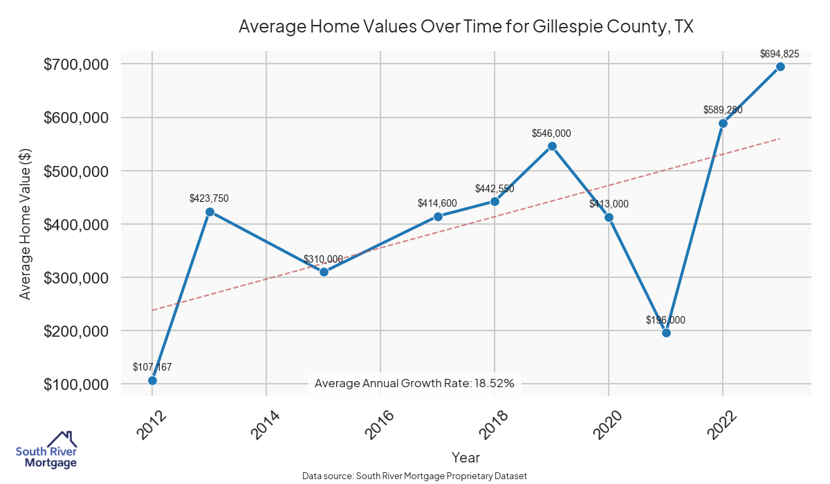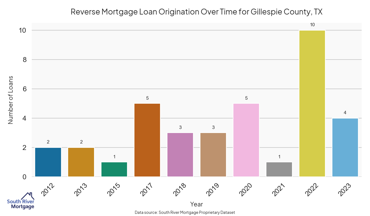 There are approximately 33 active reverse mortgage loans in Gillespie County. The average interest rate in Gillespie County is 7.41% for reverse mortgages. The average maximum claim amount (the lesser of the appraisal or lending limit), among reverse mortgage borrowers, in Gillespie County was $723,888.89 in 2024.
