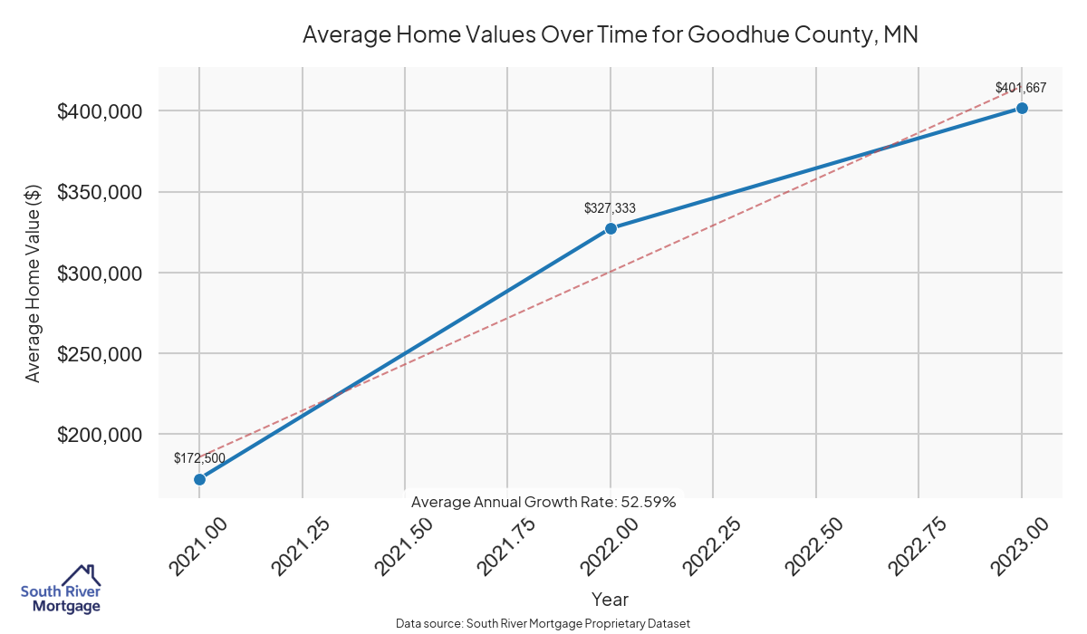 In 2024, there were 8 active reverse mortgage loans in Goodhue County, Minnesota. The average home value in Goodhue County is $408,400.75.