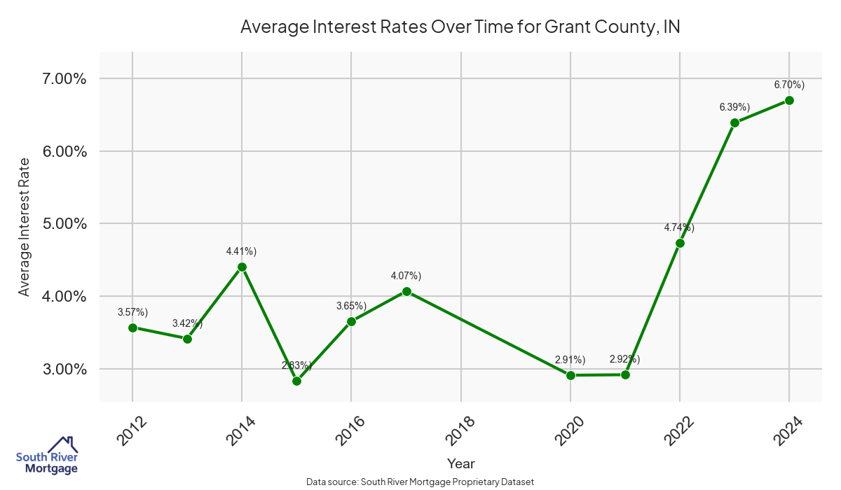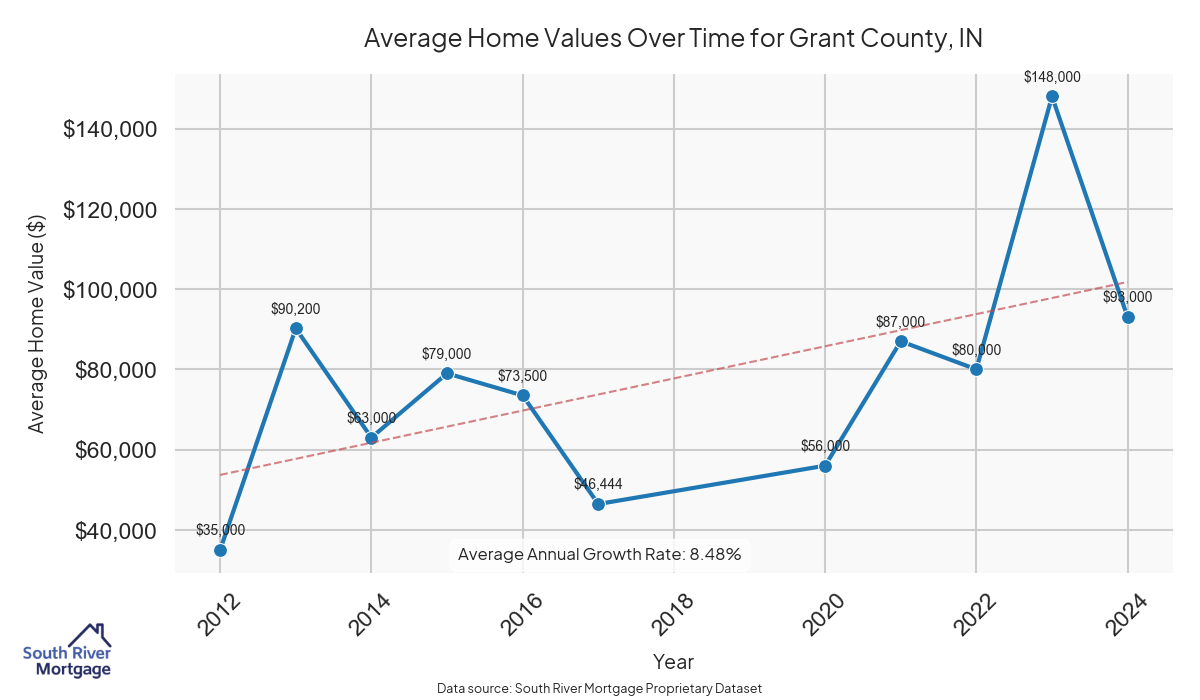 In 2024, there were 22 active reverse mortgage loans in Grant County, Indiana. The average home value in Grant County is $108,051.77.
